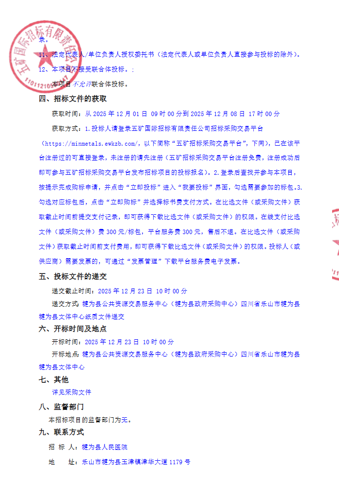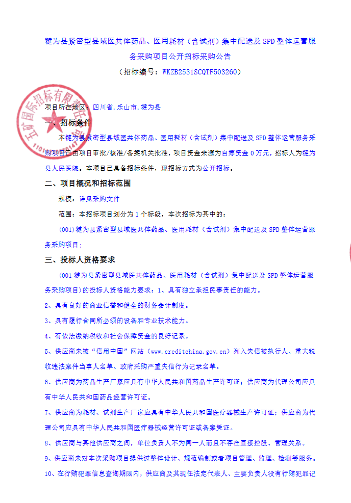 【乐山市犍为县人民医院】四川省乐山市犍为县紧密型县域医共体药品、医用耗材(含试剂)集中配送及SPD整体运营服务采购项目公开招标采购公告
