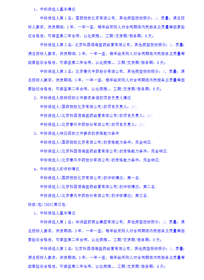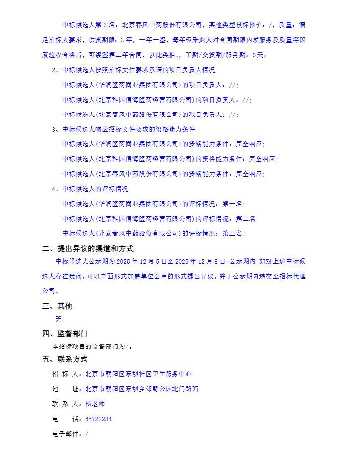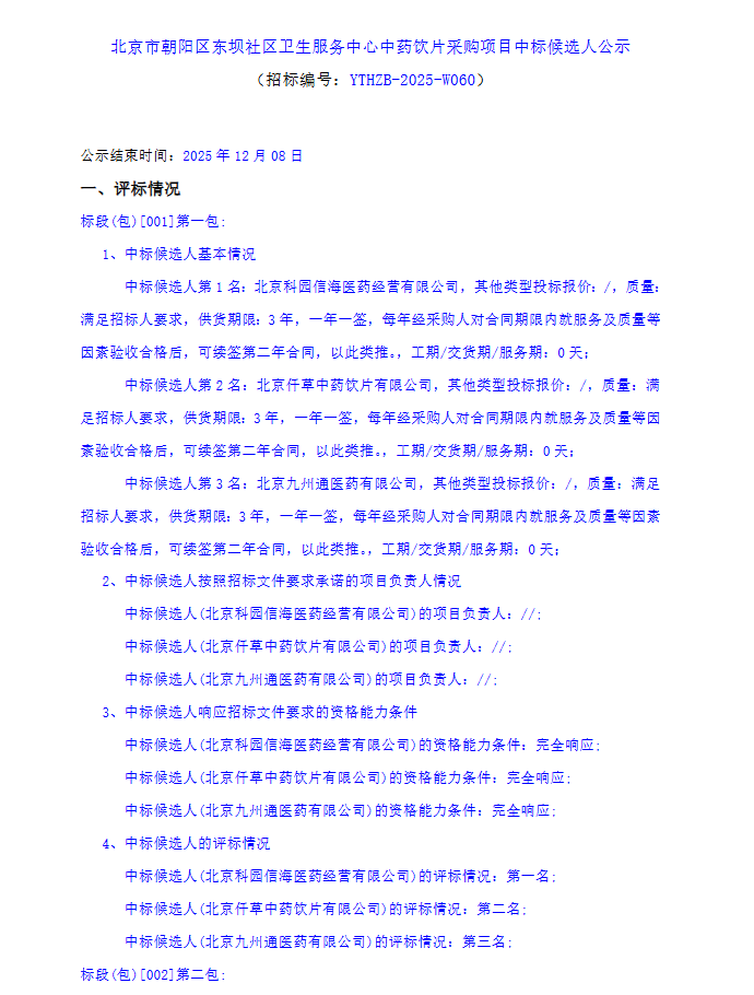 【北京市朝阳区东坝社区卫生服务中心】北京市朝阳区东坝社区卫生服务中心中药饮片采购项目中标候选人公示