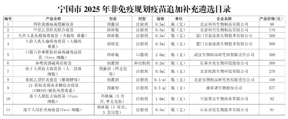 附:宁国市2025年非免疫规划疫苗追加补充遴选目录