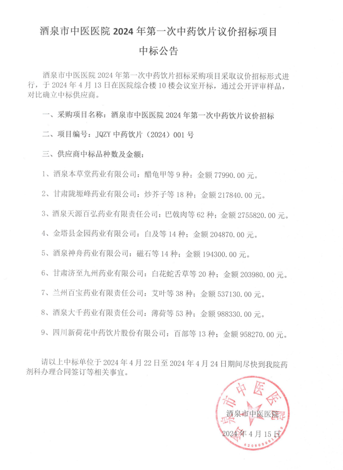 【酒泉市中医医院】甘肃省酒泉市中医医院2024年第一次中药饮片议价招标项目中标公告