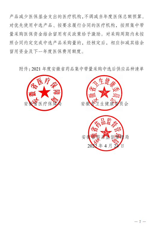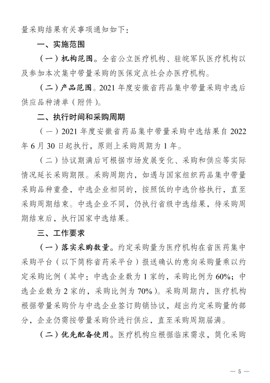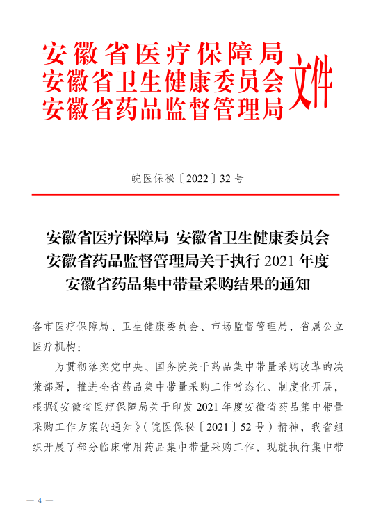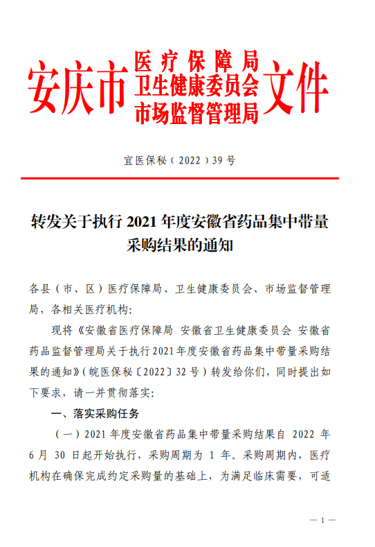 【安庆】安徽省安庆市医疗保障局转发关于执行2021年度安徽省药品集中带量采购结果的通知