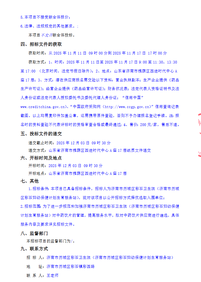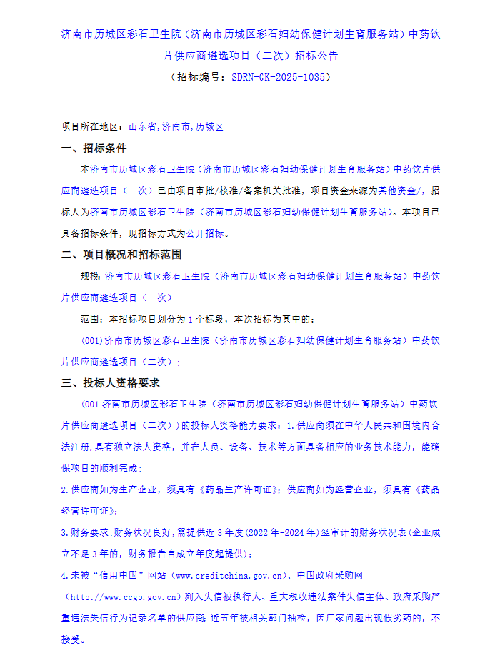 【济南市历城区彩石卫生院】山东省济南市历城区彩石卫生院(济南市历城区彩石妇幼保健计划生育服务站)中药饮片供应商遴选项目(二次)招标公告
