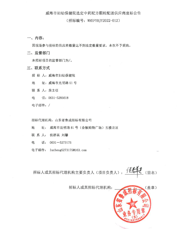 【威海市妇幼保健院】山东省威海市妇幼保健院选定中药配方颗粒配送供应商废标公告