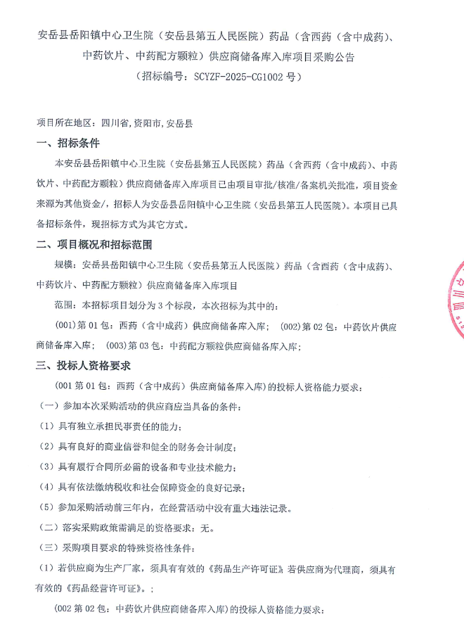 【资阳市安岳县岳阳镇中心卫生院】四川省资阳市安岳县岳阳镇中心卫生院(安岳县第五人民医院)药品(含西药(含中成药)、中药饮片、中药配方颗粒)供应商储备库入库项目采购公告