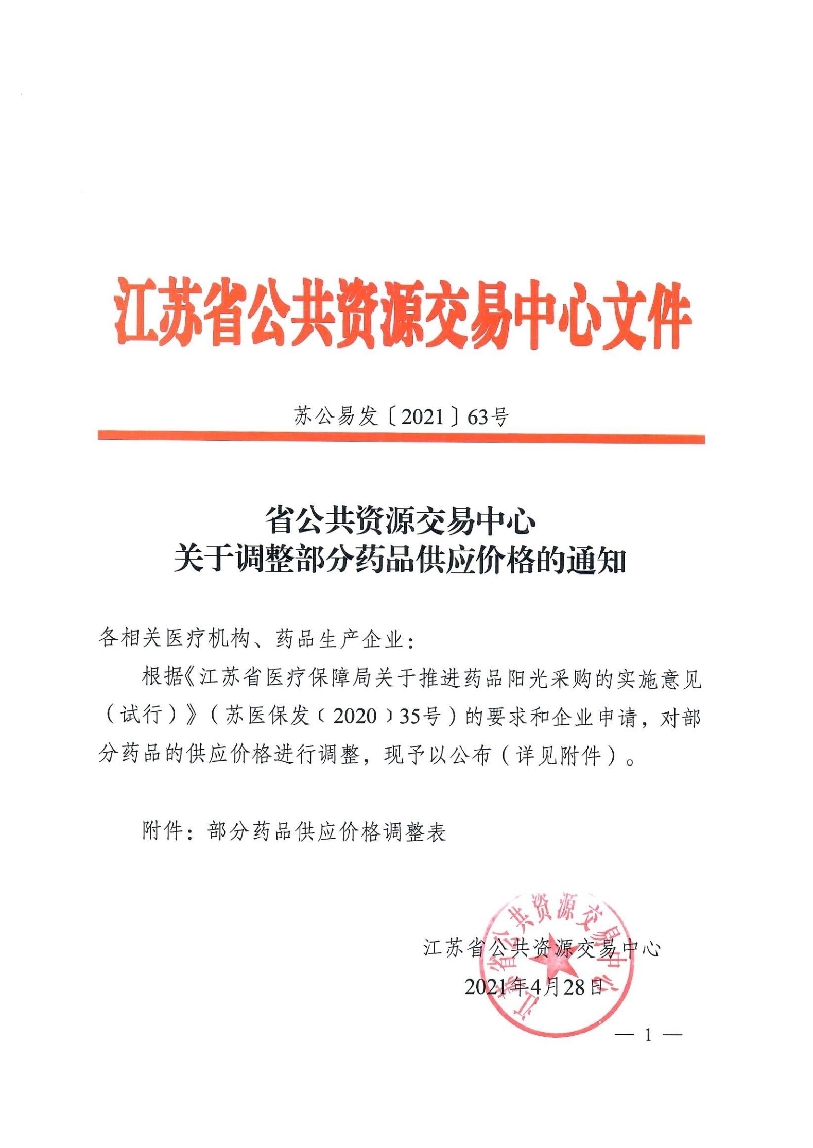 【江苏】江苏省公共资源交易中心关于调整部分药品供应价格的通知