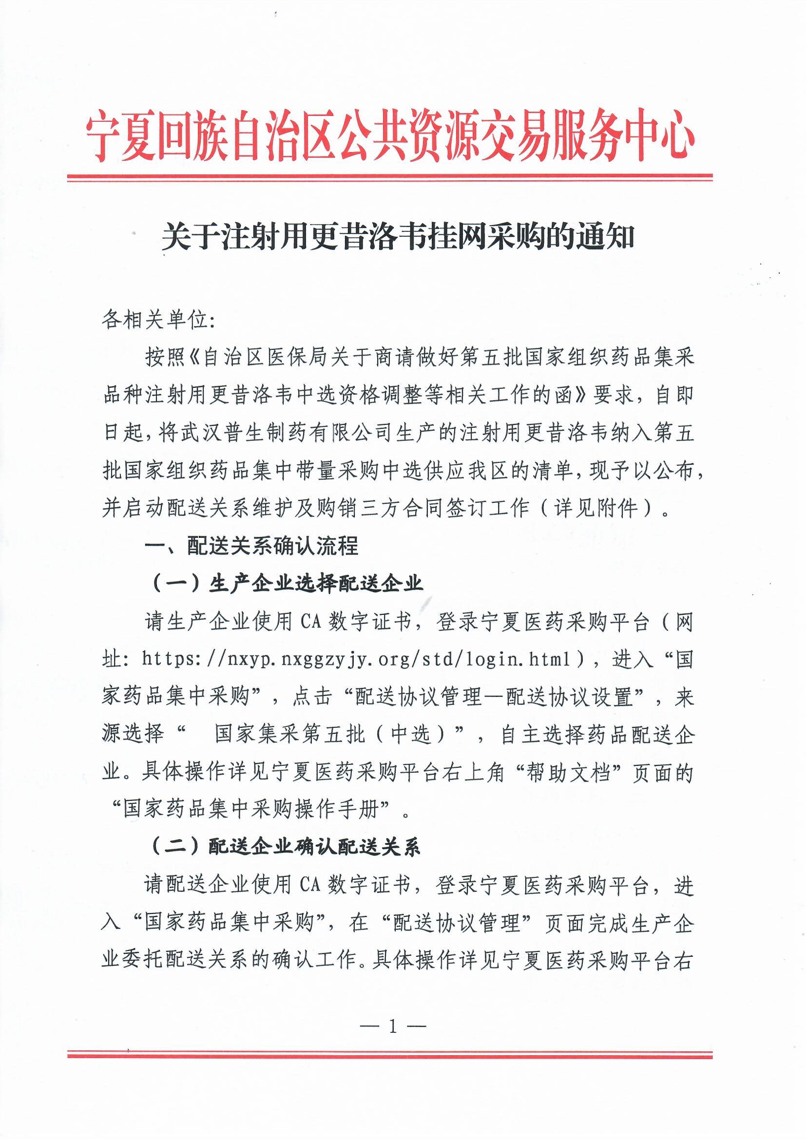 按照《自治区医保局关于商请做好第五批国家组织药品集采品种注射用更昔洛韦中选资格调整等相关工作的函》要求,自即日起,将武汉普生制药有限公司生产的注射用更昔洛韦纳入第五批国家组织药品集中带量采购中选供应我区的清单,现予以公布,并启动配送关系维护及购销三方合同签订工作(详见附件)。