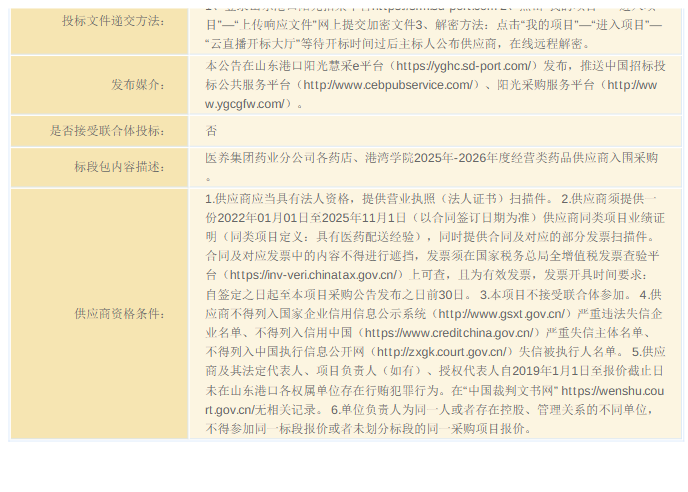 【山东港口医养健康管理集团】山东港口医养健康管理集团有限公司直属各药业分公司药品类供应商开放式框架协议采购项目