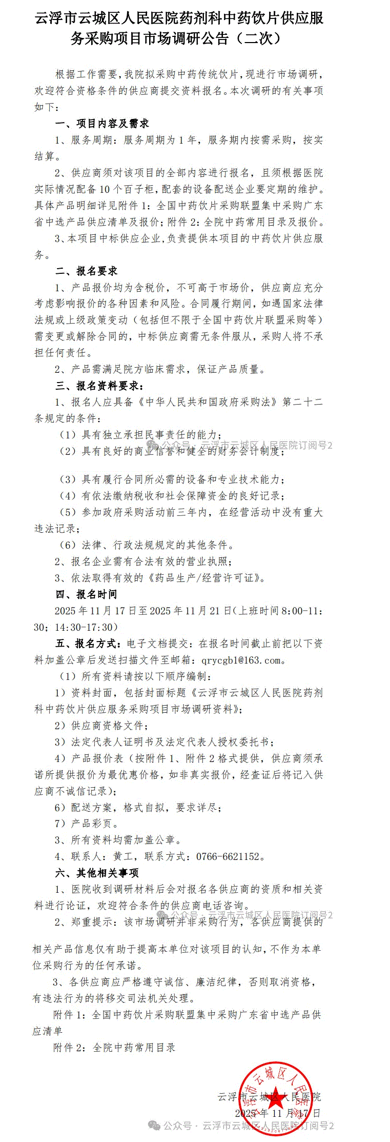 【云浮市云城区人民医院】广东省云浮市云城区人民医院药剂科中药饮片供应服务采购项目市场调研公告(二次)
