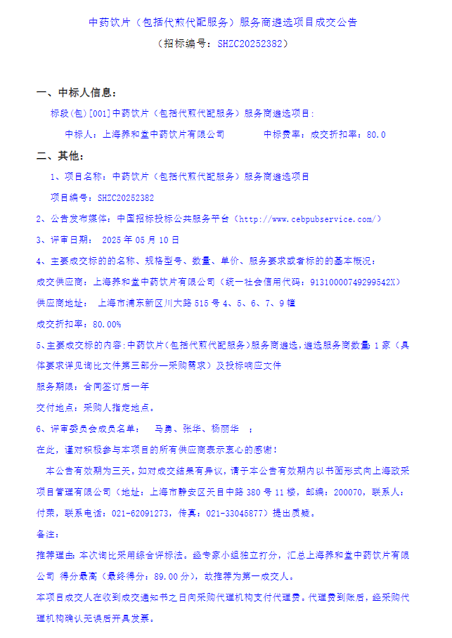 【上海市浦东新区南码头社区卫生服务中心】上海市浦东新区南码头社区卫生服务中心中药饮片(包括代煎代配服务)服务商遴选项目成交公告