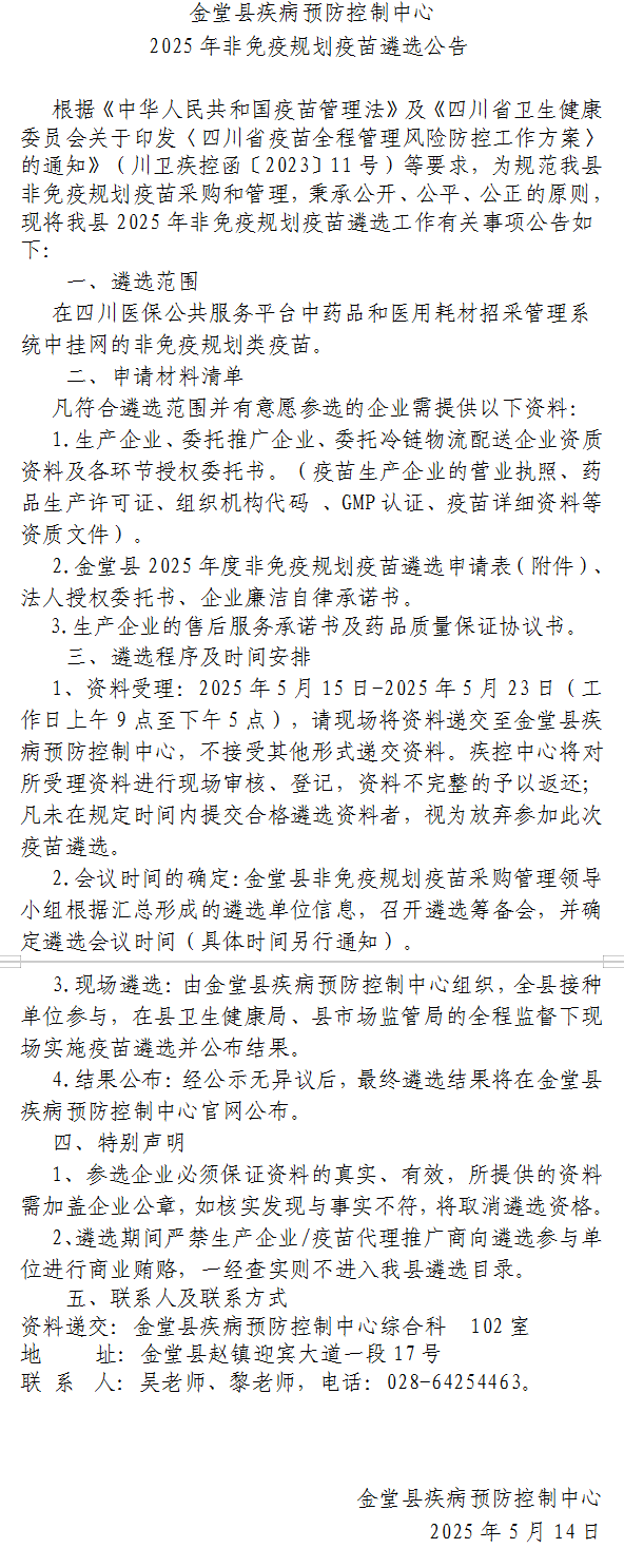 【成都】金堂县疾病预防控制中心2025年非免疫规划疫苗遴选公告