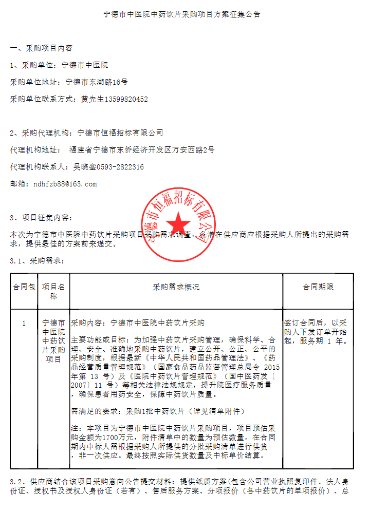 【宁德市中医院】福建省宁德市中医院中药饮片采购项目方案征集公告招标公告