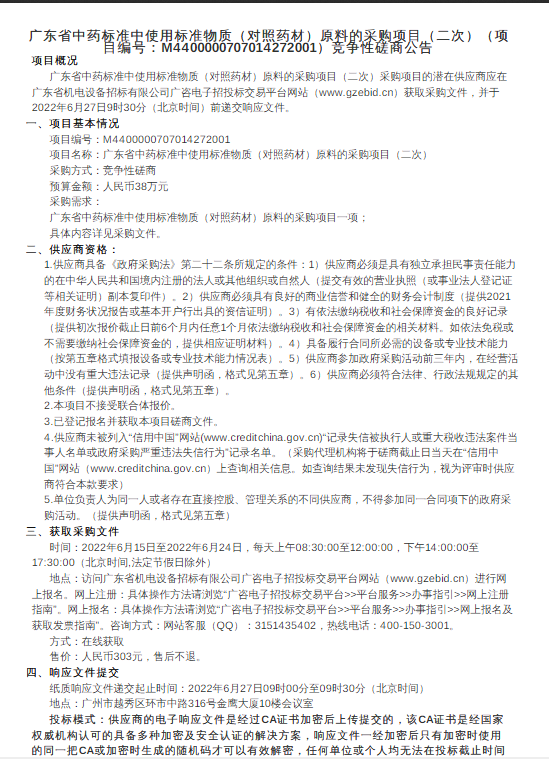 【广东】广东省中药标准中使用标准物质(对照药材)原料的采购项目(二次)-招标公告