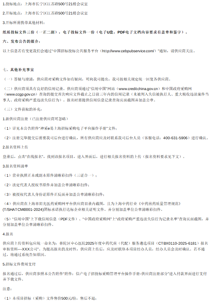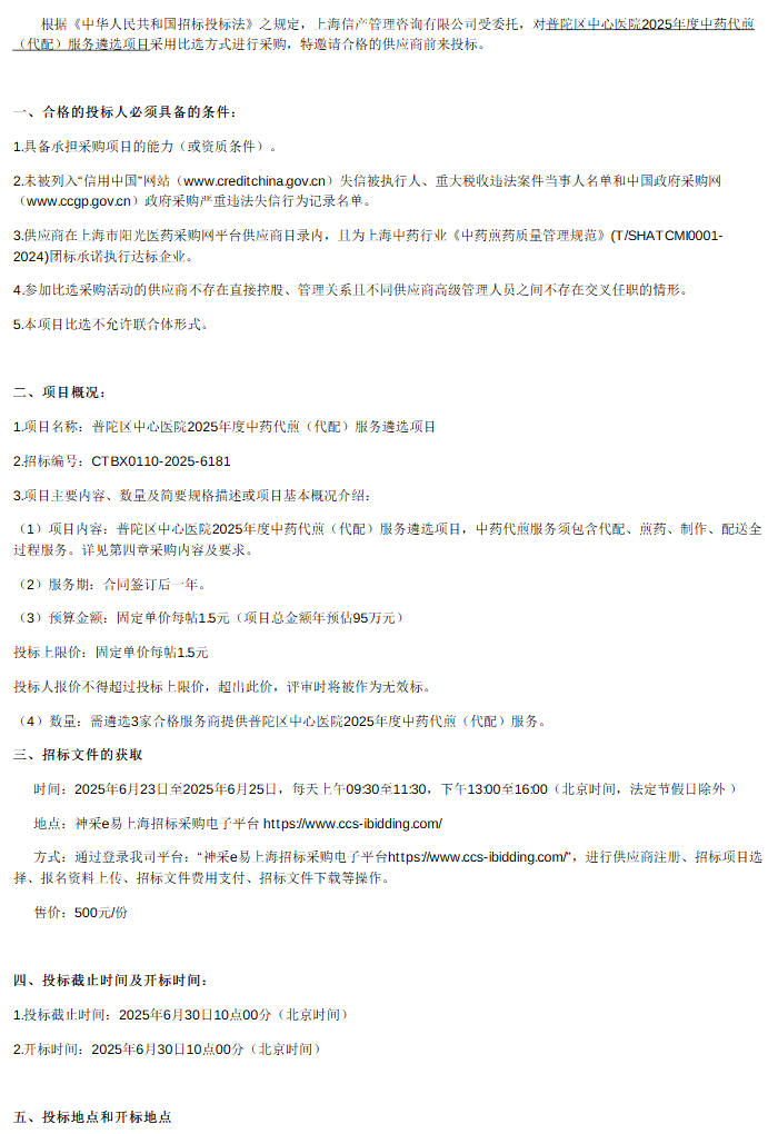 【上海市普陀区中心医院】上海市普陀区中心医院2025年度中药代煎(代配)服务遴选项目比选公告