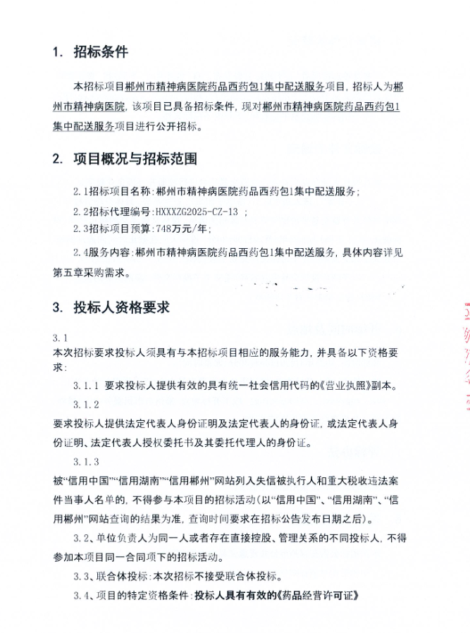 【郴州市精神病医院】湖南省郴州市精神病医院药品西药包1集中配送服务招标公告