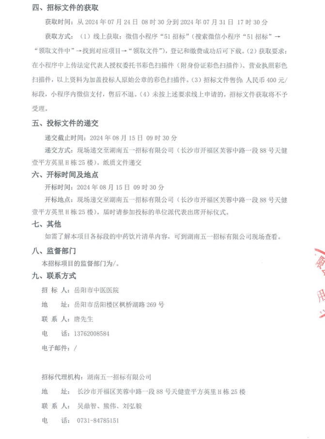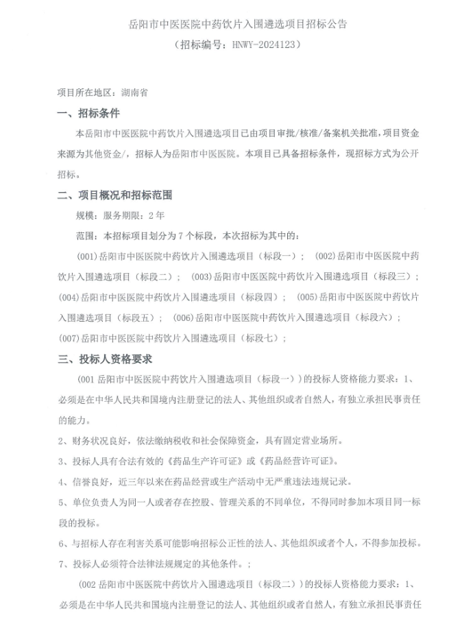 【岳阳市中医医院】湖南省岳阳市中医医院中药饮片入围遴选项目招标公告