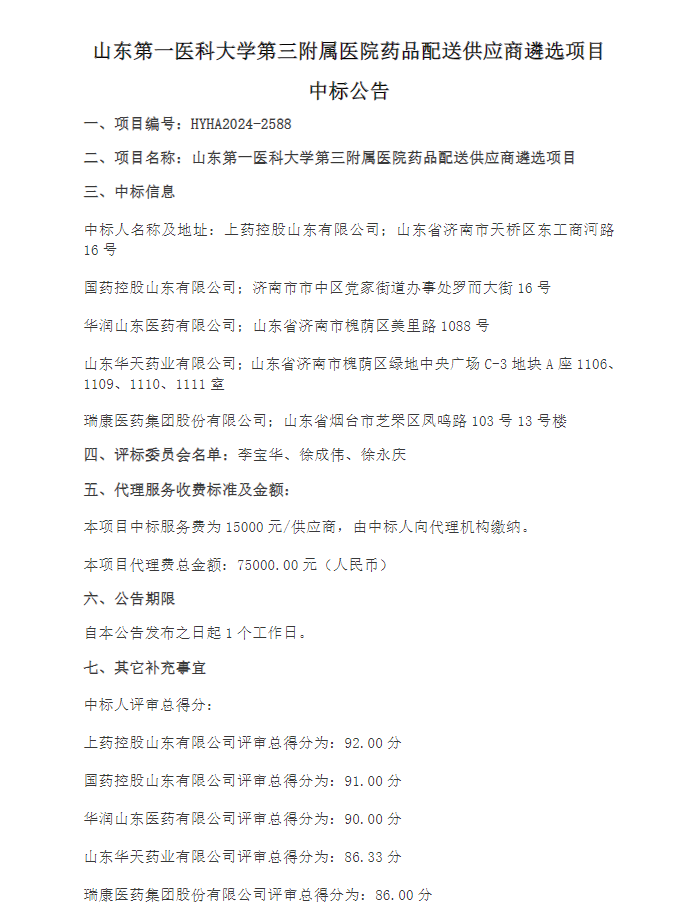 【山东第一医科大学第三附属医院】山东第一医科大学第三附属医院药品配送供应商遴选项目中标公告