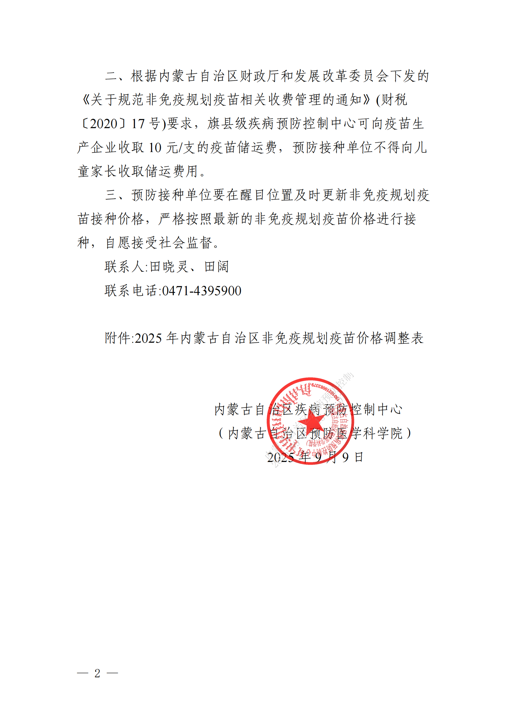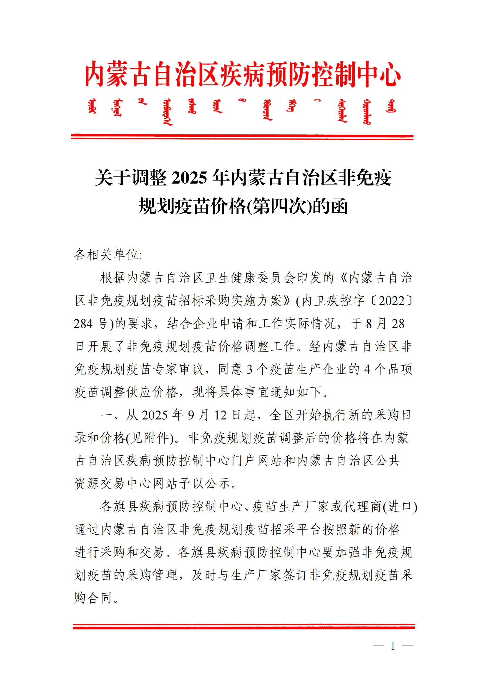 一、从2025年9月12日起,全区开始执行新的采购目录和价格(见附件)。非免疫规划疫苗调整后的价格将在内蒙古自治区疾病预防控制中心门户网站和内蒙古自治区公共资源交易中心网站予以公示。