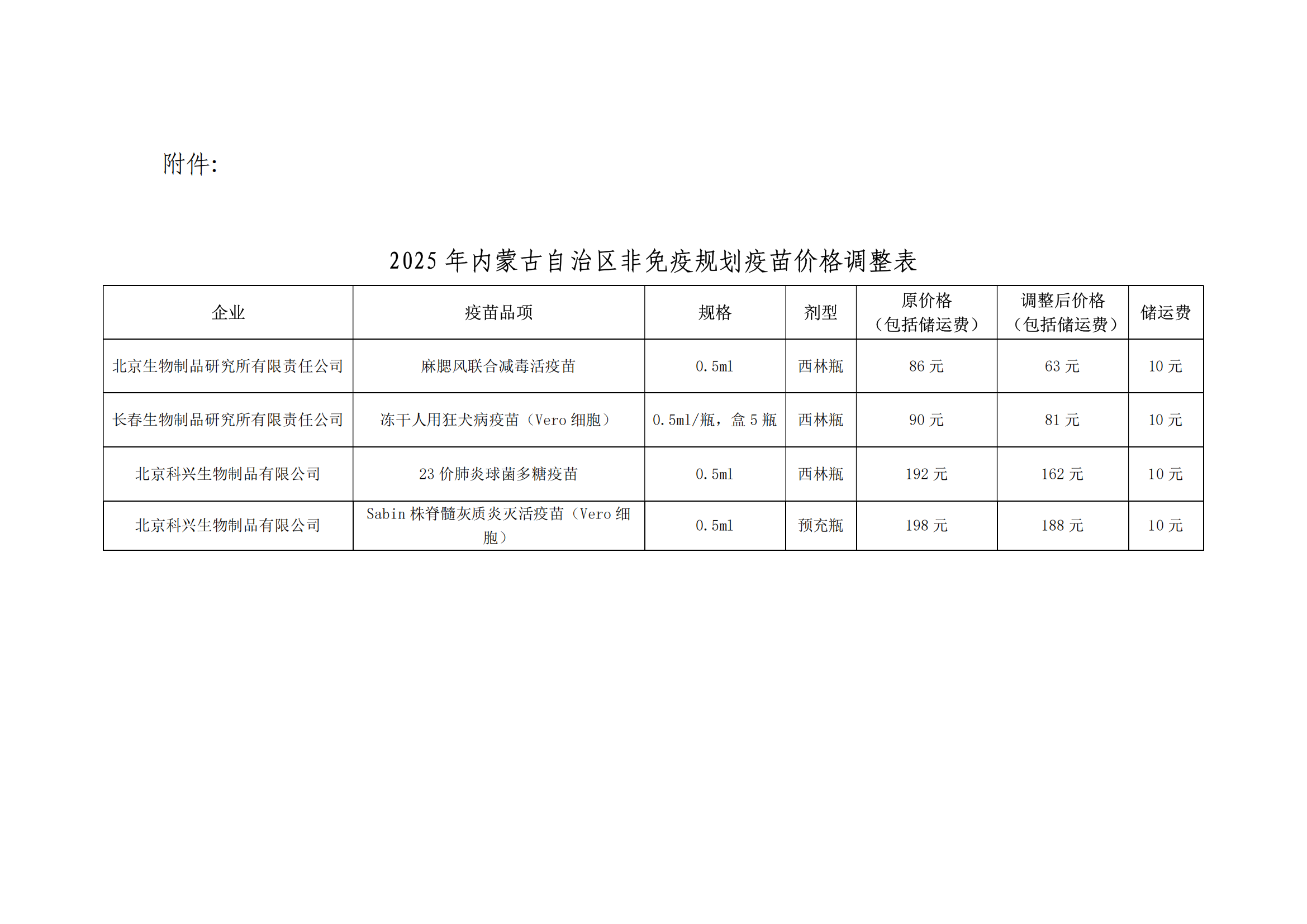 2025年内蒙古自治区非免疫规划疫苗价格调整表