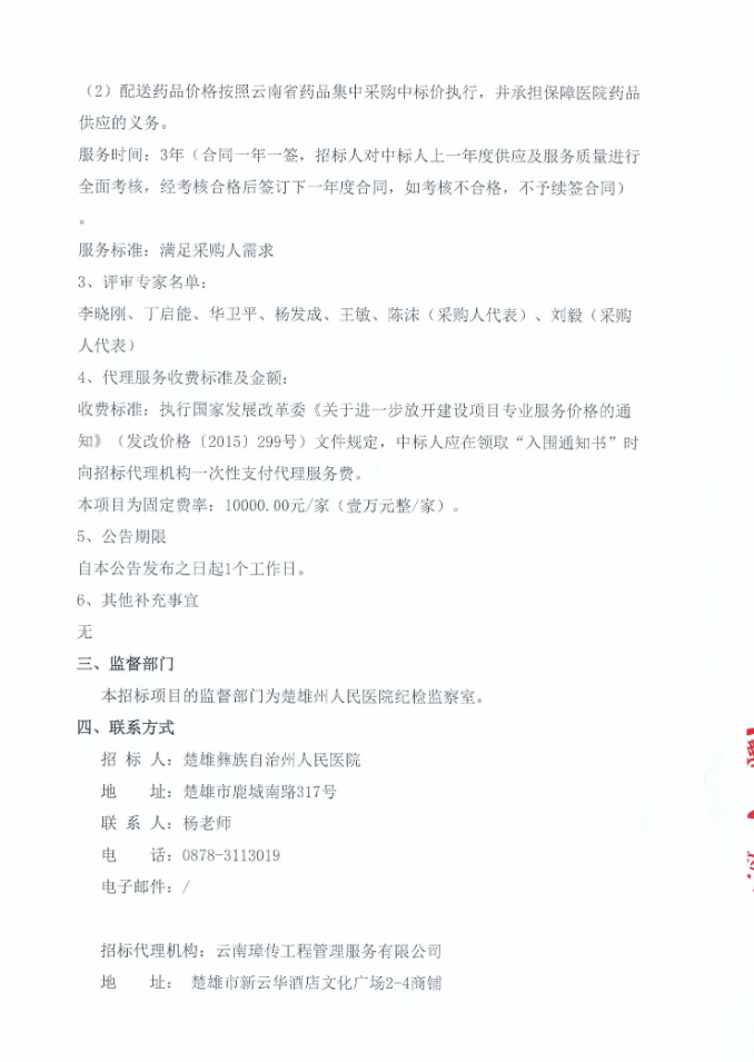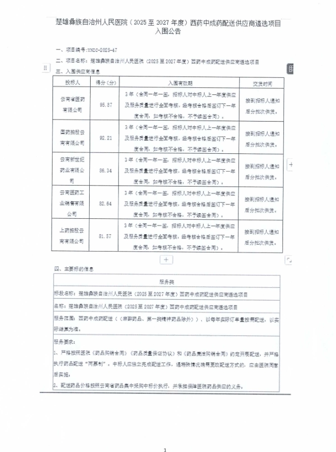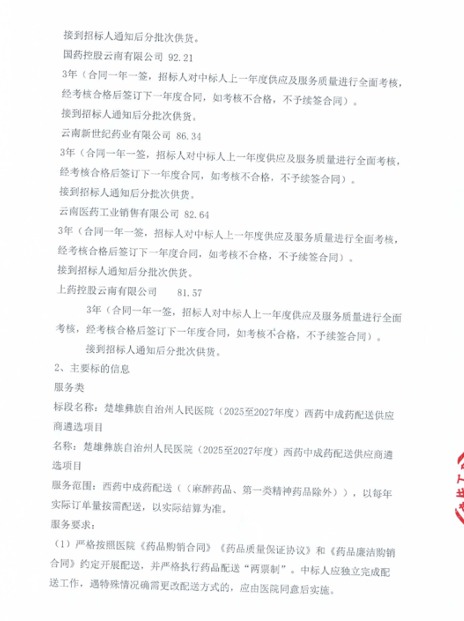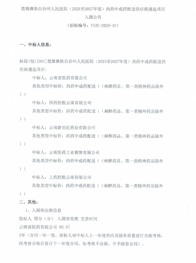 【楚雄彝族自治州人民医院】云南省楚雄彝族自治州人民医院(2025至2027年度)西药中成药配送供应商遴选项目入围公告
