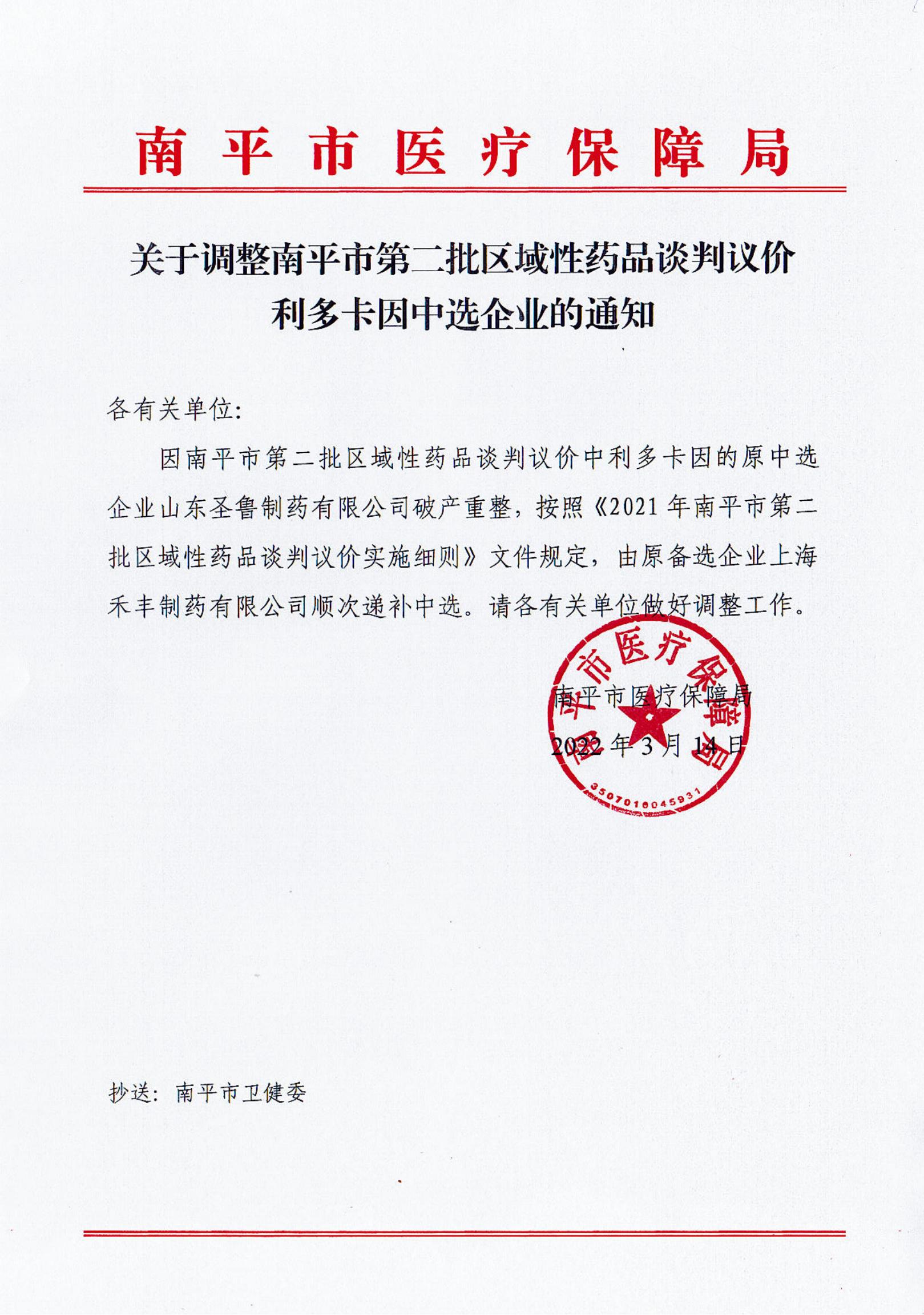 【南平】福建省关于调整南平市第二批区域性药品谈判议价利多卡因中选企业的通知