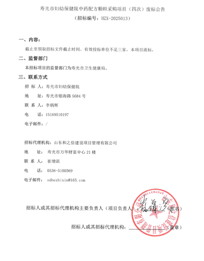 【潍坊市寿光市妇幼保健院】山东省寿光市妇幼保健院中药配方颗粒采购项目(四次)废标公告