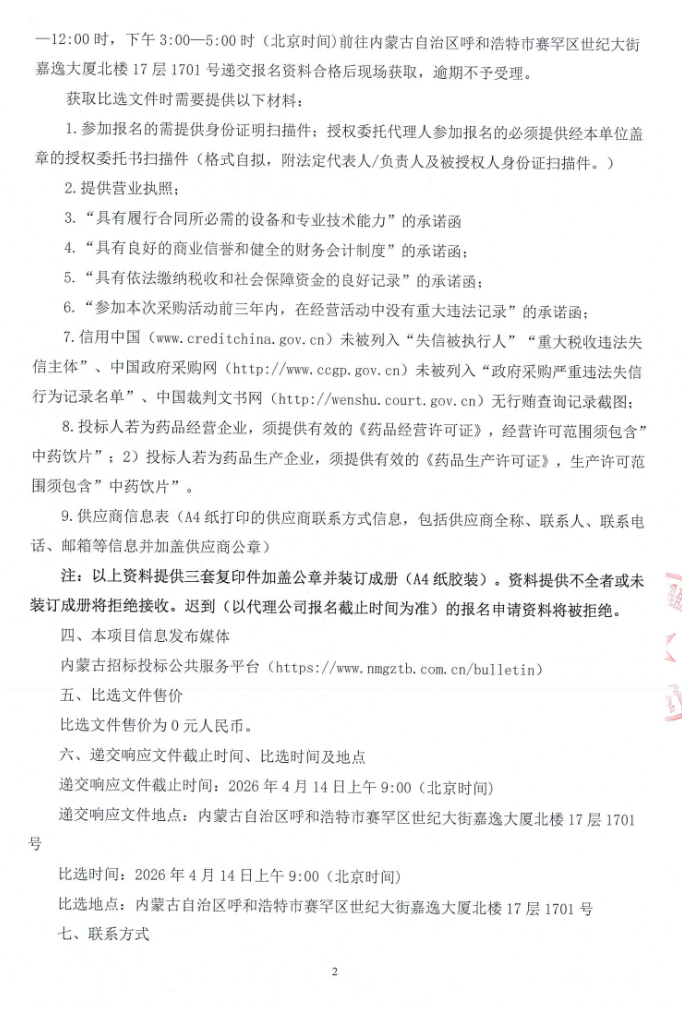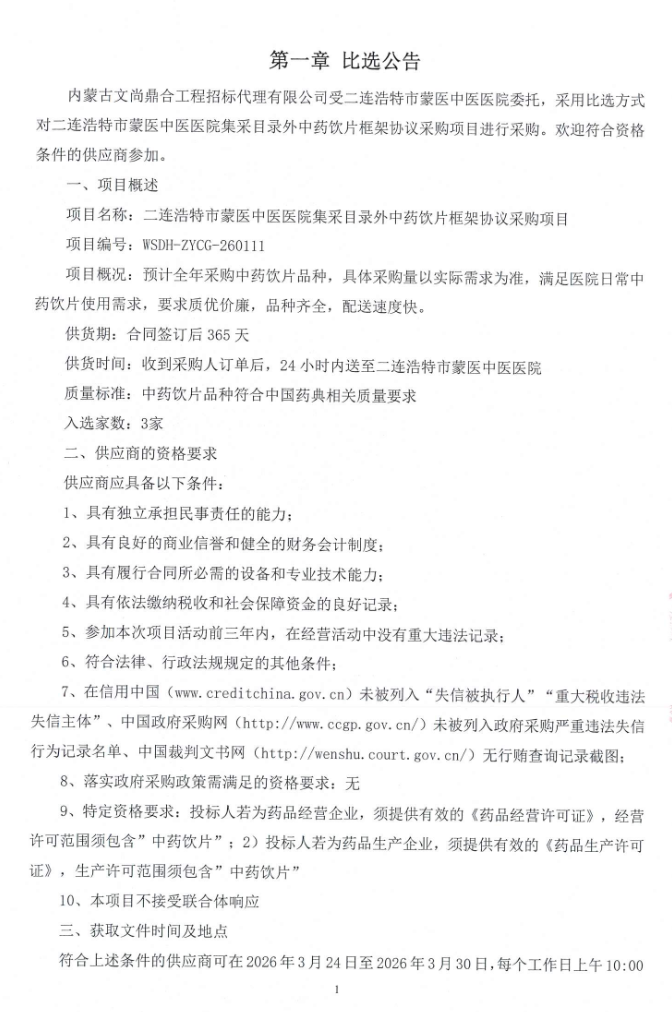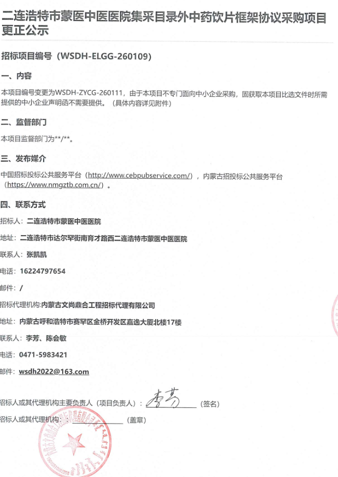 【锡林郭勒盟二连浩特市蒙医中医医院】内蒙古自治区二连浩特市蒙医中医医院集采目录外中药饮片框架协议采购项目更正公示
