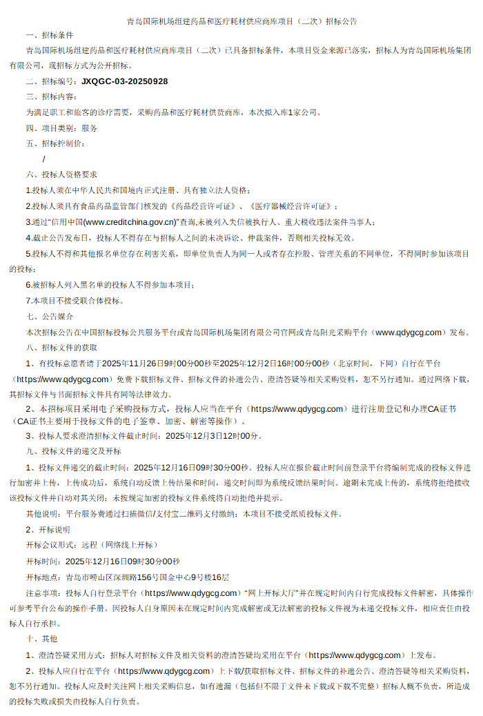 【青岛国际机场集团有限公司】山东省青岛国际机场组建药品和医疗耗材供应商库项目(二次)公开招标公告