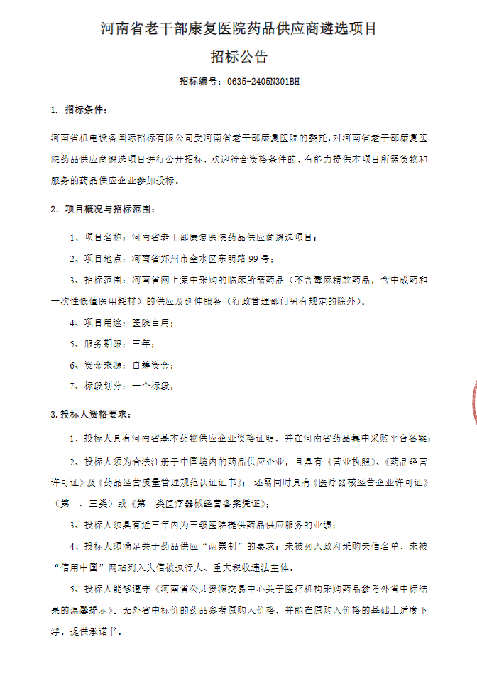 【河南省老干部康复医院】河南省老干部康复医院药品供应商遴选项目-公开招标公告