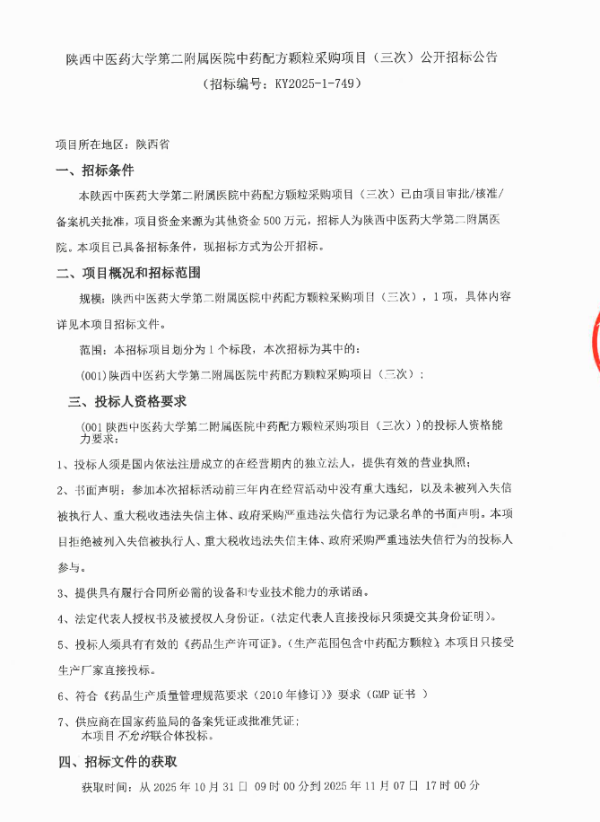 【陕西中医药大学第二附属医院】陕西中医药大学第二附属医院中药配方颗粒采购项目(三次)公开招标公告