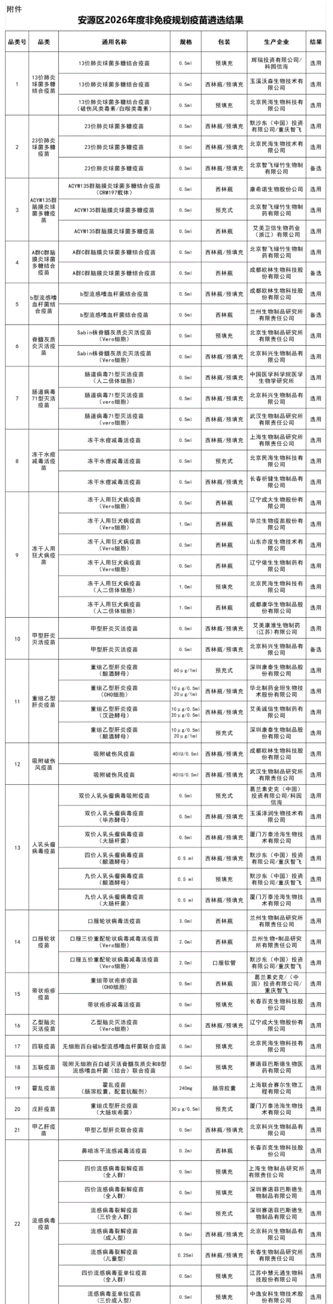 【萍乡】安源区2026年度非免疫规划疫苗遴选结果公示