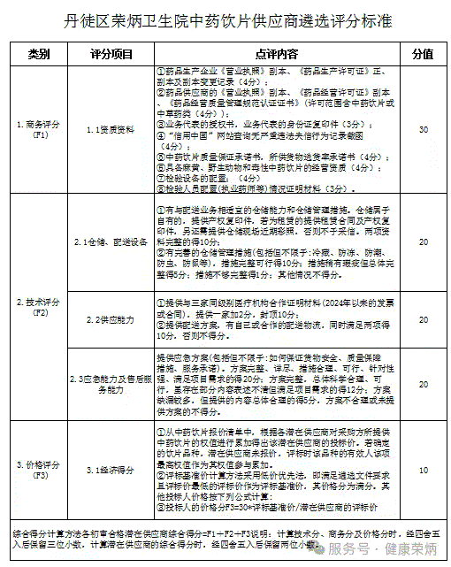 八、评审方式:综合评分法(细则见附件1《丹徒区荣炳卫生院中药饮片供应商遴选评分标准》)
