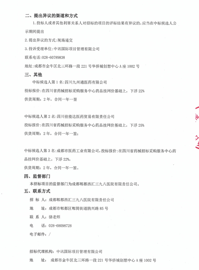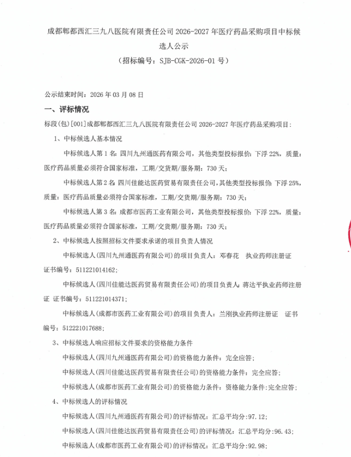【成都郫都西汇三九八医院】四川省成都郫都西汇三九八医院有限责任公司2026-2027年医疗药品采购项目中标候选人公示