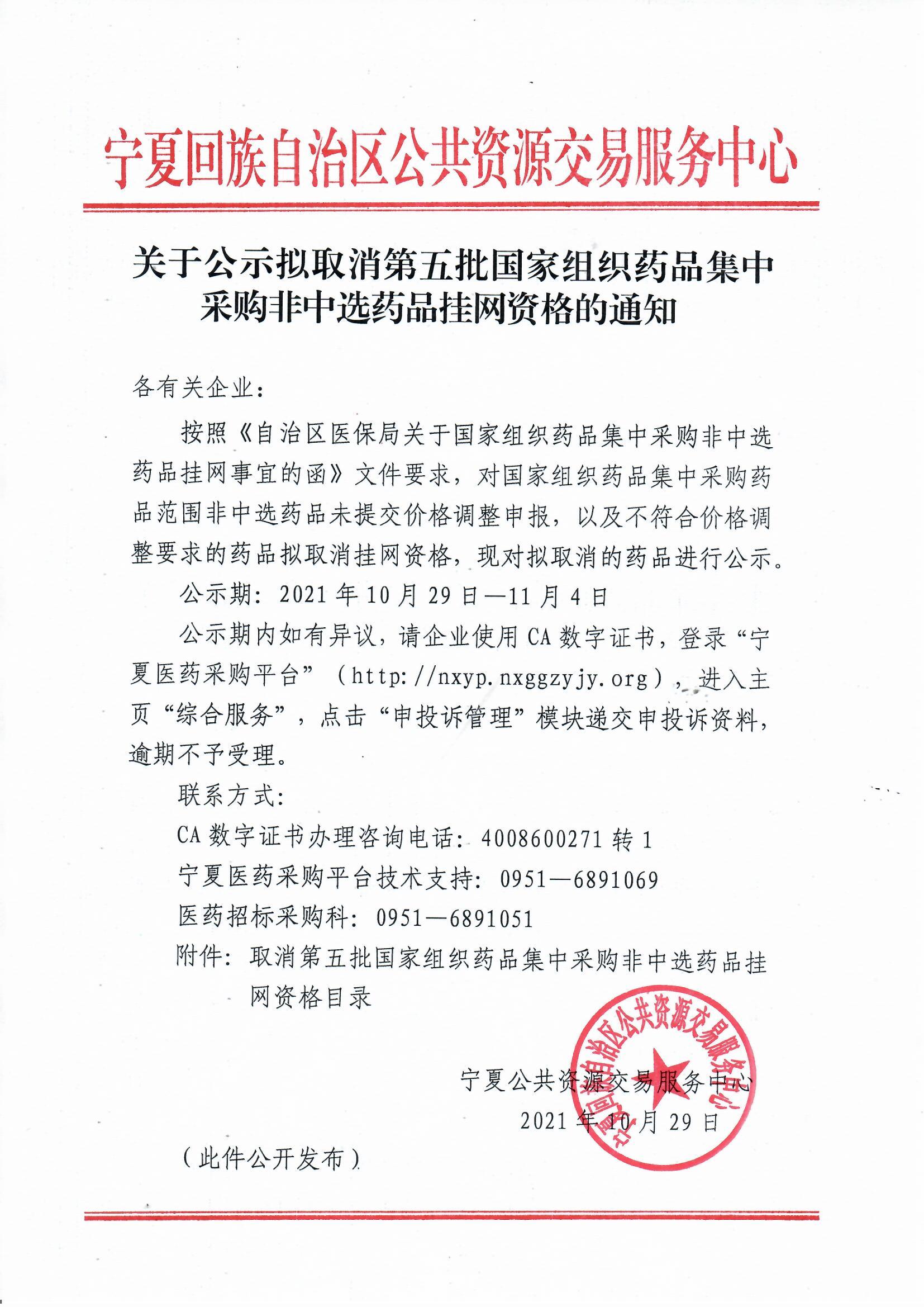 【宁夏】2021年宁夏自治区关于公示拟取消第五批国家组织药品集中采购非中选药品挂网资格的通知