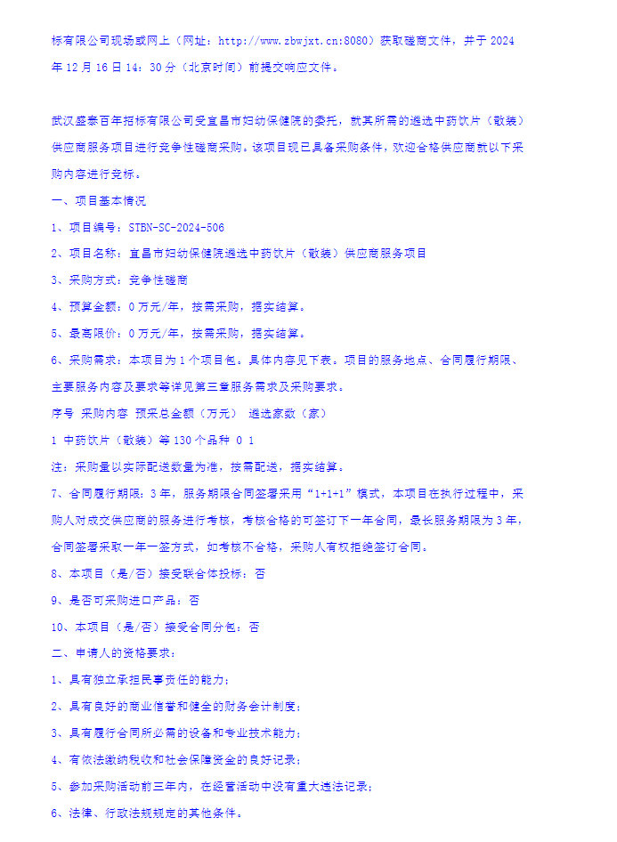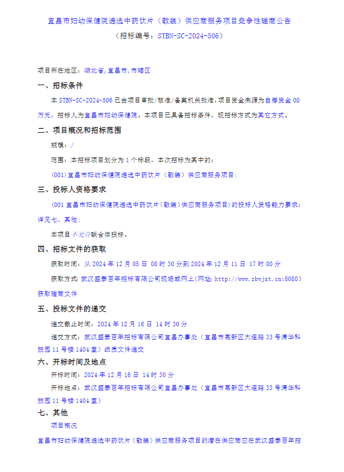 【宜昌市妇幼保健院】湖北省宜昌市妇幼保健院遴选中药饮片(散装)供应商服务项目竞争性磋商公告