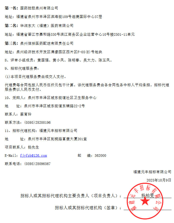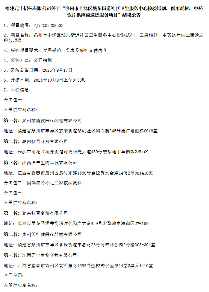 【泉州市丰泽区城东街道社区卫生服务中心】福建元丰招标有限公司关于“泉州市丰泽区城东街道社区卫生服务中心检验试剂、医用耗材、中药饮片供应商遴选服务项目”结果公告