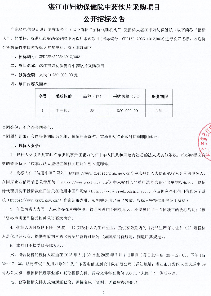 【湛江市妇幼保健院】广东省湛江市妇幼保健院中药饮片采购项目公开招标公告