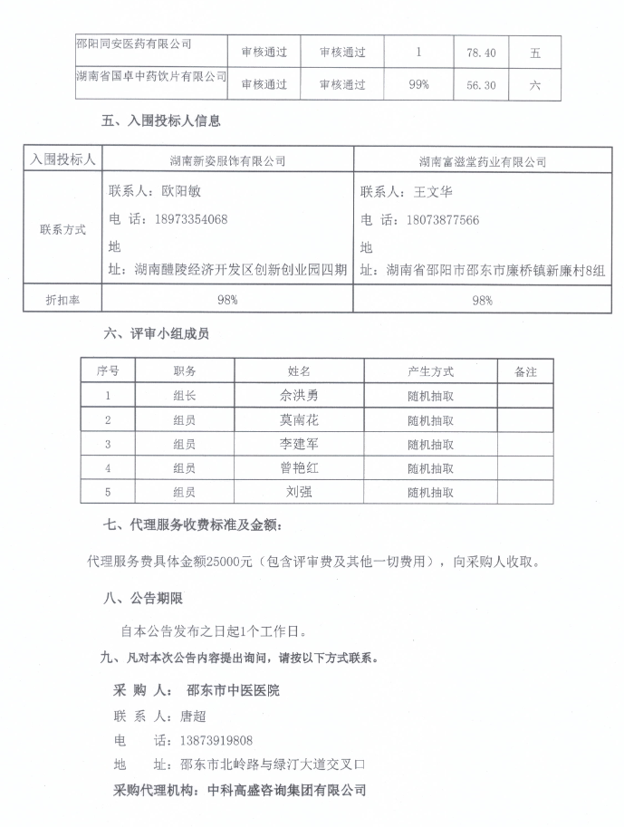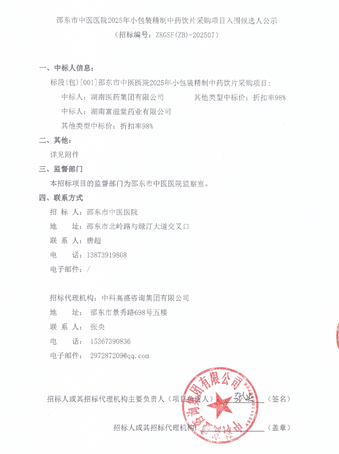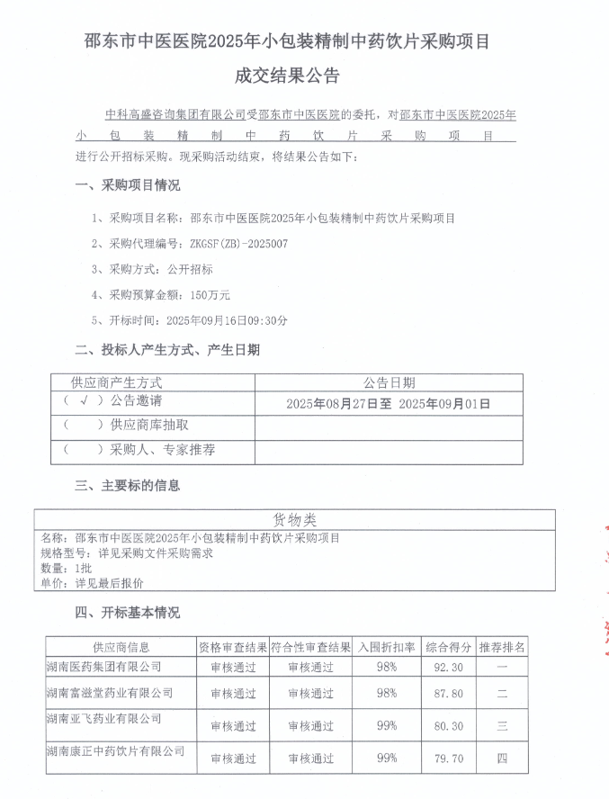 【邵阳市邵东市中医医院】湖南省邵东市中医医院2025年小包装精制中药饮片采购项目入围候选人公示