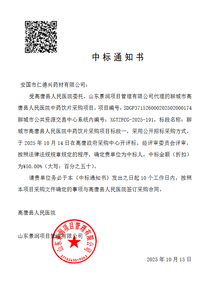 【聊城市高唐县人民医院】山东省聊城市高唐县人民医院中药饮片采购项目标段一中标通知书