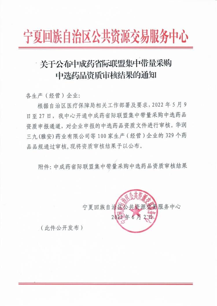 【宁夏】宁夏回族自治区关于公布中成药省际联盟集中带量采购中选药品资质审核结果的通知