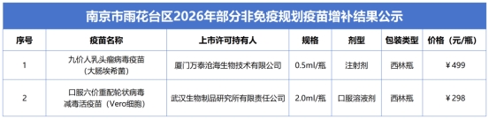为满足雨花台区群众对部分非免疫规划疫苗的接种需求,保障疫苗供应,根据《中华人民共和国疫苗管理法》、《预防接种工作规范(2023年版)》、《关于进一步加强全省非免疫规划疫苗采购供应管理工作的通知》(苏疾控﹝2025﹞12号)、《关于印发江苏省人乳头瘤病毒(HPV)疫苗国家免疫规划工作实施方案的通知》(苏疾控〔2026〕1号)文件要求,雨花台区非免疫规划疫苗遴选工作委员会于2026年3月12日对部分非免疫规划疫苗进行了增补,现将增补结果予以公示(详见下图)。