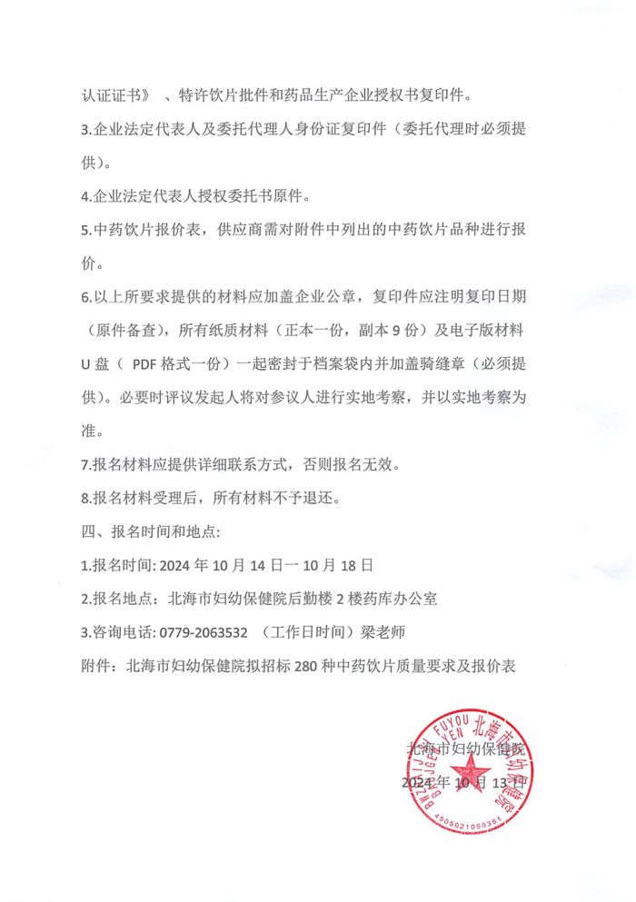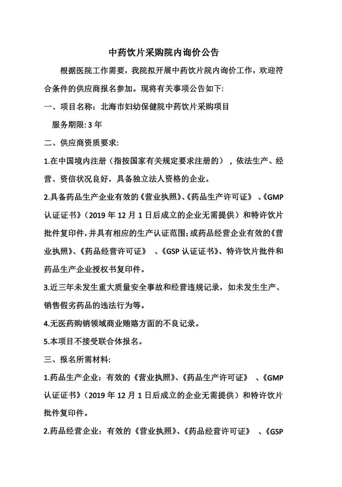 【北海市妇幼保健院】广西壮族自治区北海市妇幼保健院关于中药饮片采购院内询价公告