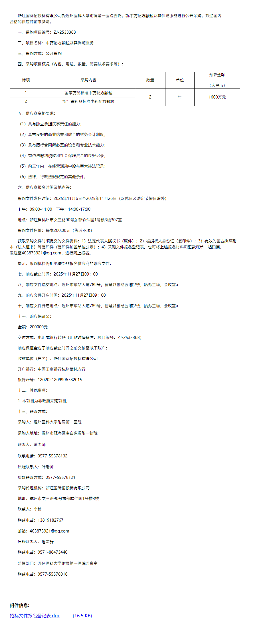 【温州医科大学附属第一医院】浙江国际招投标有限公司关于温州医科大学附属第一医院中药配方颗粒及其伴随服务的公开采购公告