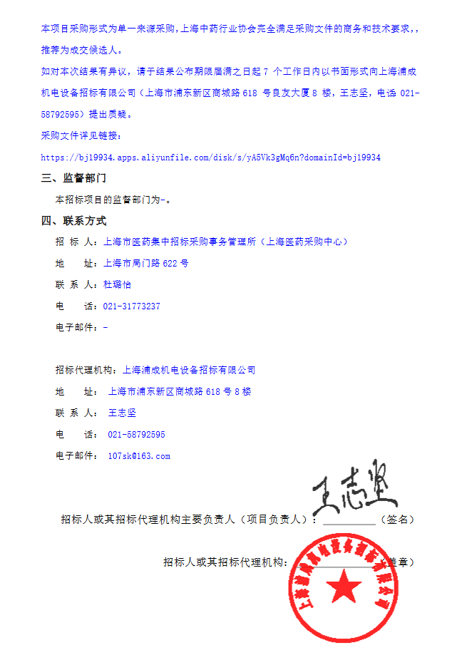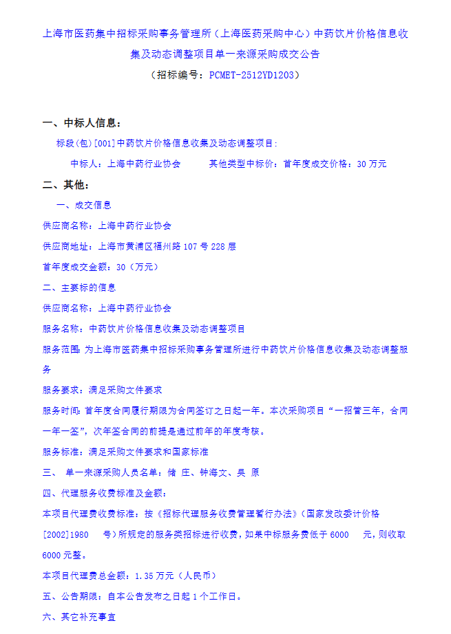 【上海市医药集中招标采购事务管理所】上海市医药集中招标采购事务管理所(上海医药采购中心)中药饮片价格信息收集及动态调整项目单一来源采购成交公告