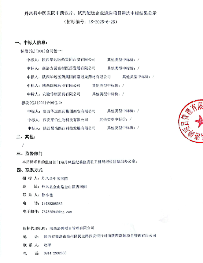 【商洛市丹凤县中医医院】陕西省商洛市丹凤县中医医院中药饮片、试剂配送企业遴选项目遴选中标结果公示