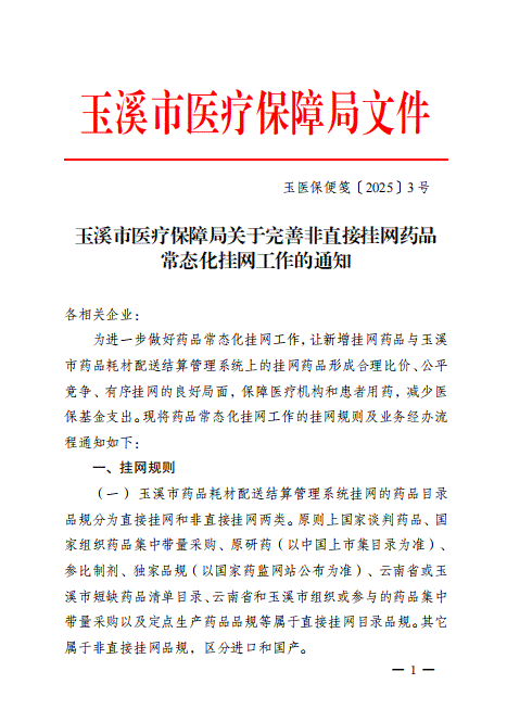 【玉溪】云南省玉溪市医疗保障局关于完善非直接挂网药品常态化挂网工作的通知