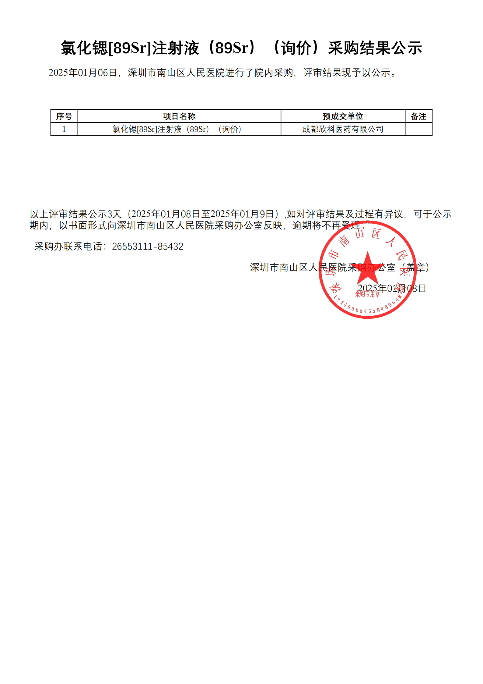 【华中科技大学协和深圳医院】广东省华中科技大学协和深圳医院氯化锶〔89Sr〕注射液(89Sr)(询价)成交候选人公示