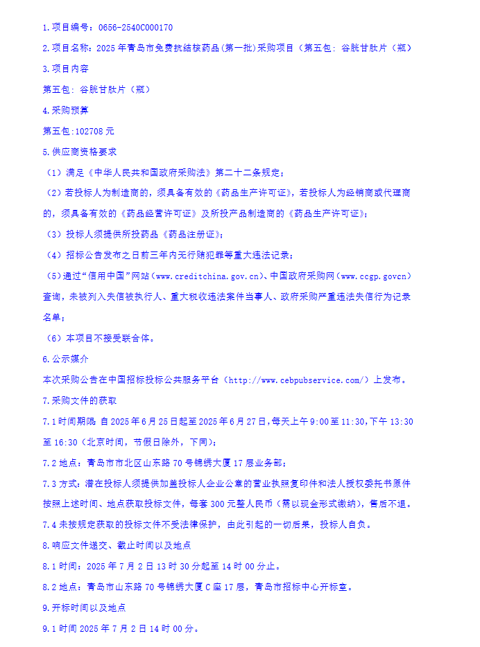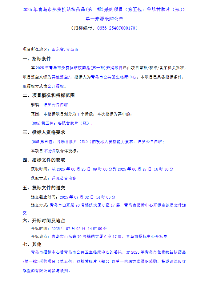 【青岛市公共卫生临床中心】山东省2025年青岛市免费抗结核药品(第一批)采购项目(第五包: 谷胱甘肽片(瓶))单一来源采购公告