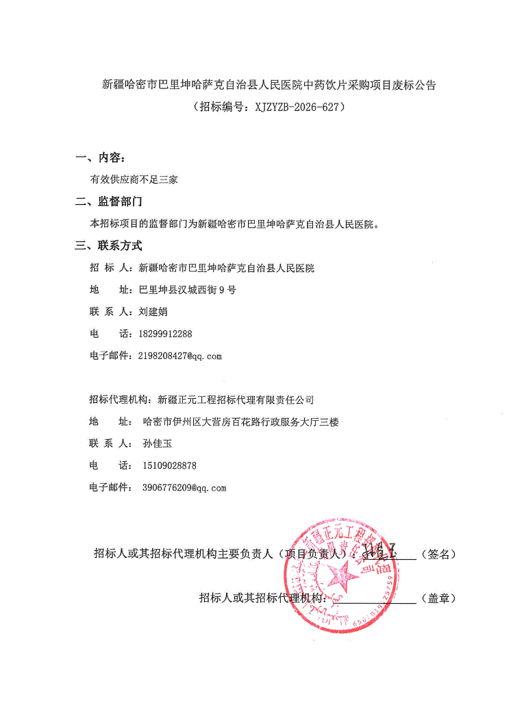 【哈密市巴里坤哈萨克自治县人民医院】新疆哈密市巴里坤哈萨克自治县人民医院中药饮片采购项目废标公告