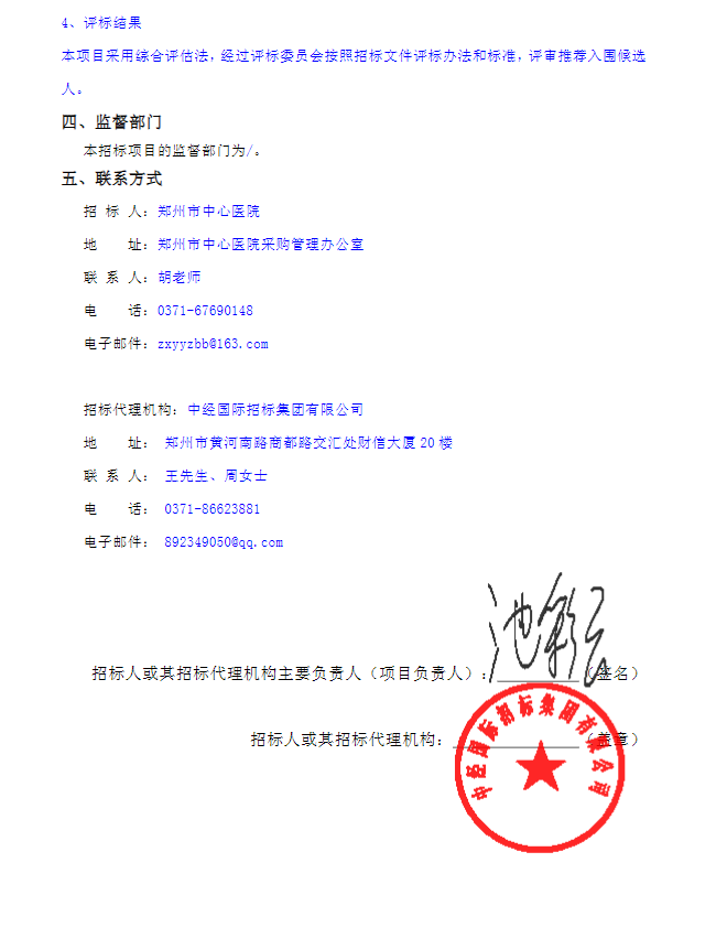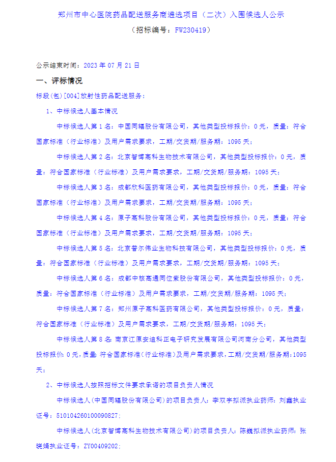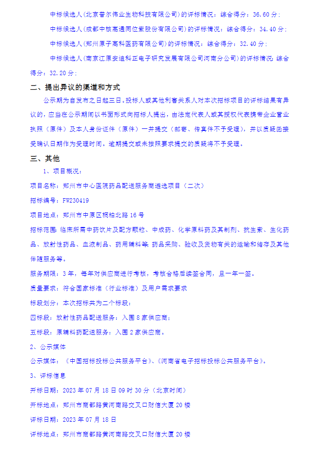 【郑州市中心医院】河南省郑州市中心医院药品配送服务商遴选项目(二次)入围候选人公示