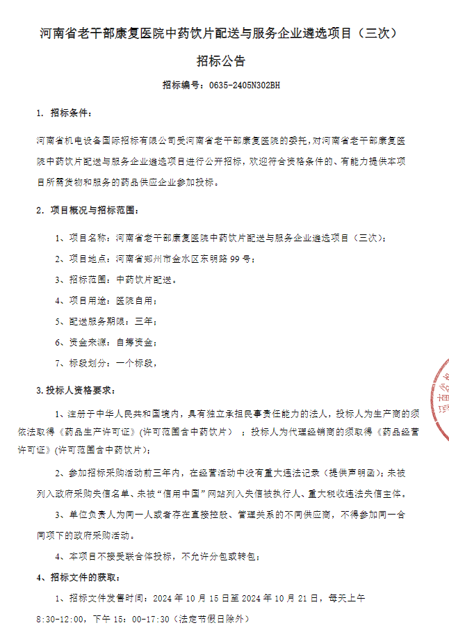 【河南省老干部康复医院】河南省老干部康复医院中药饮片配送与服务企业遴选项目(三次)招标公告